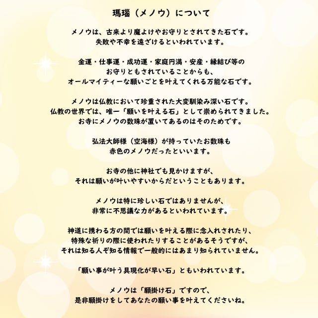 メノウは「願掛け石」ですので、是非願掛けをしてあなたの願い事を叶えてくださいね。