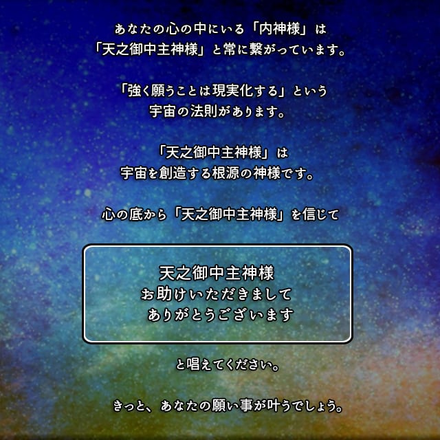 「天之御中主神様(アメノミナカヌシ様)お助けいただきましてありがとうございます」と唱えると、願い事が叶うといわれています。