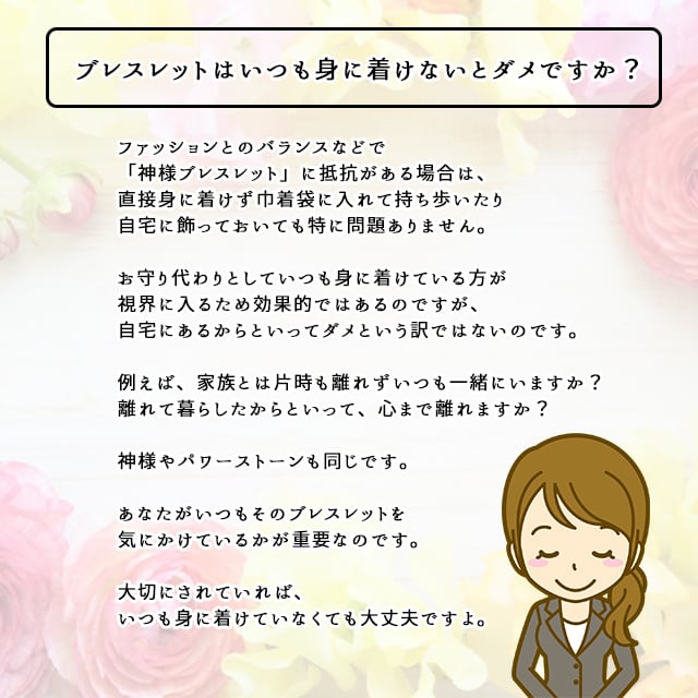 ※ブレスレットに使用しているパワーストーンは、個体や入荷時期などによって若干の違い(±0.5mm~±1mm程度)が生じる場合があります。